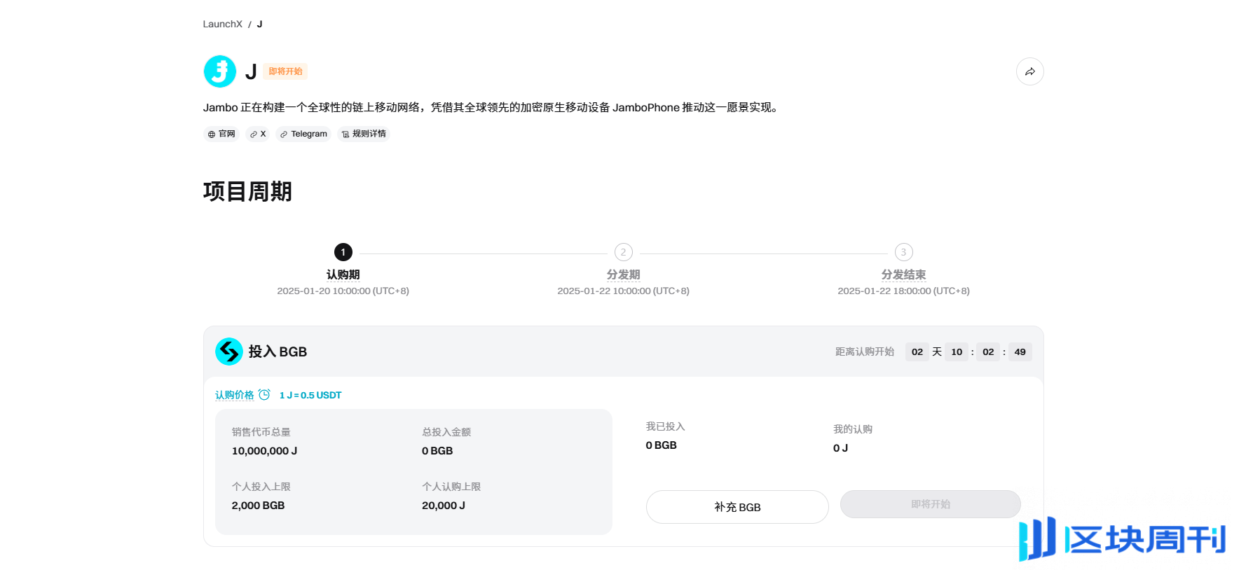 l J 代币认购已于 1 月 20 日 10 点正式开始,登录 Bitget 账户后前往 LaunchX 专区,可见 Jambo 项目的项目介绍、认购价格、剩余可认购数量等信息。点击 Jambo 项目认购入口进入认购页面。