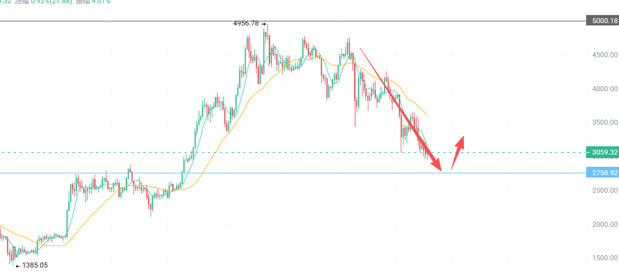 以太早上被砸到 2959 美金,现在在 3000 美金附近横着。日线高低点在下移,空头放量,昨天成交额直接干到 22 亿。