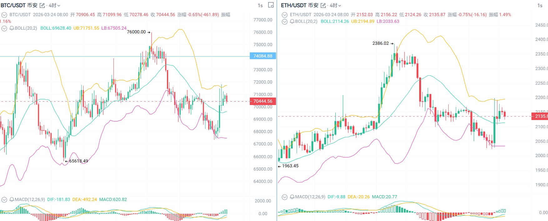 再看 $ETH ,结构已经在悄悄变强:震荡区间的高低点在抬升,同时已经突破了下跌趋势线;回调是缩量的,上涨是放量的,而且下跌波的回撤幅度已经被完全吃掉。之前3月6日那次假突破虽然没站稳,但现在价格依然维持在震荡区间的中上方,说明多头在逐步掌控节奏。今天早上还走出了一个上涨吞没形态,价格已经贴近区间上沿。整体来看,现在的信号很明确:短线多头占优,但中期反弹已接近尾声。所以策略也很简单——能做多,但别上头;有利润,记得收;等真正拉高的时候,机会反而在空头那边。