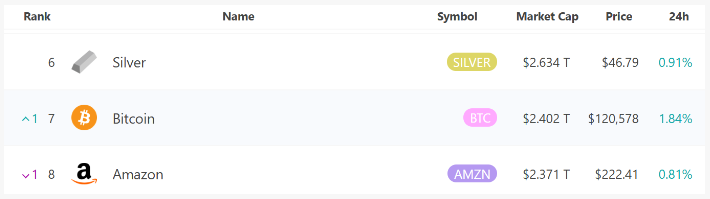 比特币再次超越亚马逊升至全球资产市值排名第7位 BlockWeeks 10月3日消息,据8MarketCap数据显示,随着比特币价格升至12万美元上面,其市值已突破2.4万亿美元,24小时涨幅1.84%,再次超越亚马逊(2.371万亿美元),升至全球资产市值排名第7位,暂落后于白银。 上一篇:美股上市公司Bitcoin Depot收购National Bitcoin ATM扩大美国业务 下一篇:Metaplanet CEO:加密市场基本面仍在增强,股价下跌不会影响持续积累BTC 发表回复 请登录后评论...登录后才能评论 提交