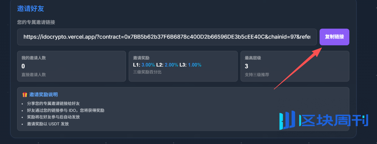 推荐奖励有前提条件:用户的地址必须参与IDO,才能获得邀请资格。如果地址没有参与记录,那么它的邀请链接是失效的,没有用处