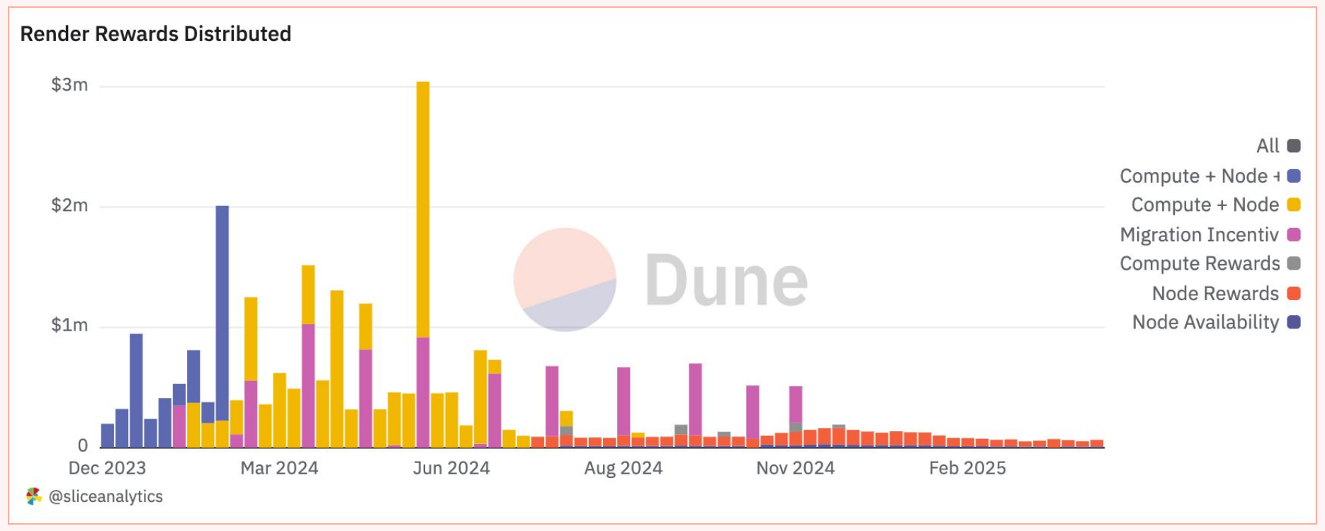 截至2025年4月,Render Network拥有3,784个活跃的链上节点,为不断增长的创意和AI应用生态系统提供去中心化计算能力。迄今为止,用户访问GPU能力已燃烧超过1.21亿RENDER代币,同时铸造了超过240万代币奖励节点运营商,显示出健康的需求和生态系统的活跃参与。此前消息显示,收入在2024年11月到12月达到每周近30万美元的峰值,这得益于关键升级(RNP-016到018)、扩展的艺术家激励和带有免费GPU积分和奖品的Advent Calendar活动。2025年4月中旬出现另一个显著峰值,每周收入达到7万美元,表明创作者需求和网络采用率正在回升。